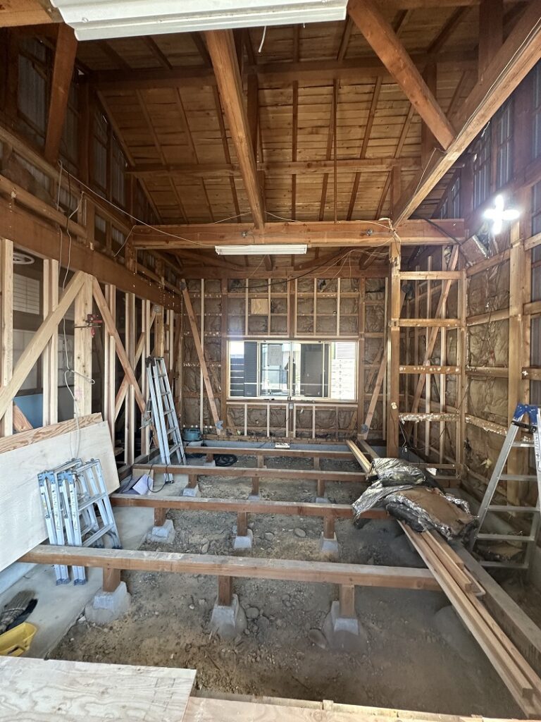 束石や大引きなど 年季が入っています。これから職人さんが補強をいれながら、断熱材もいれつつ丁寧に下地をつくります。